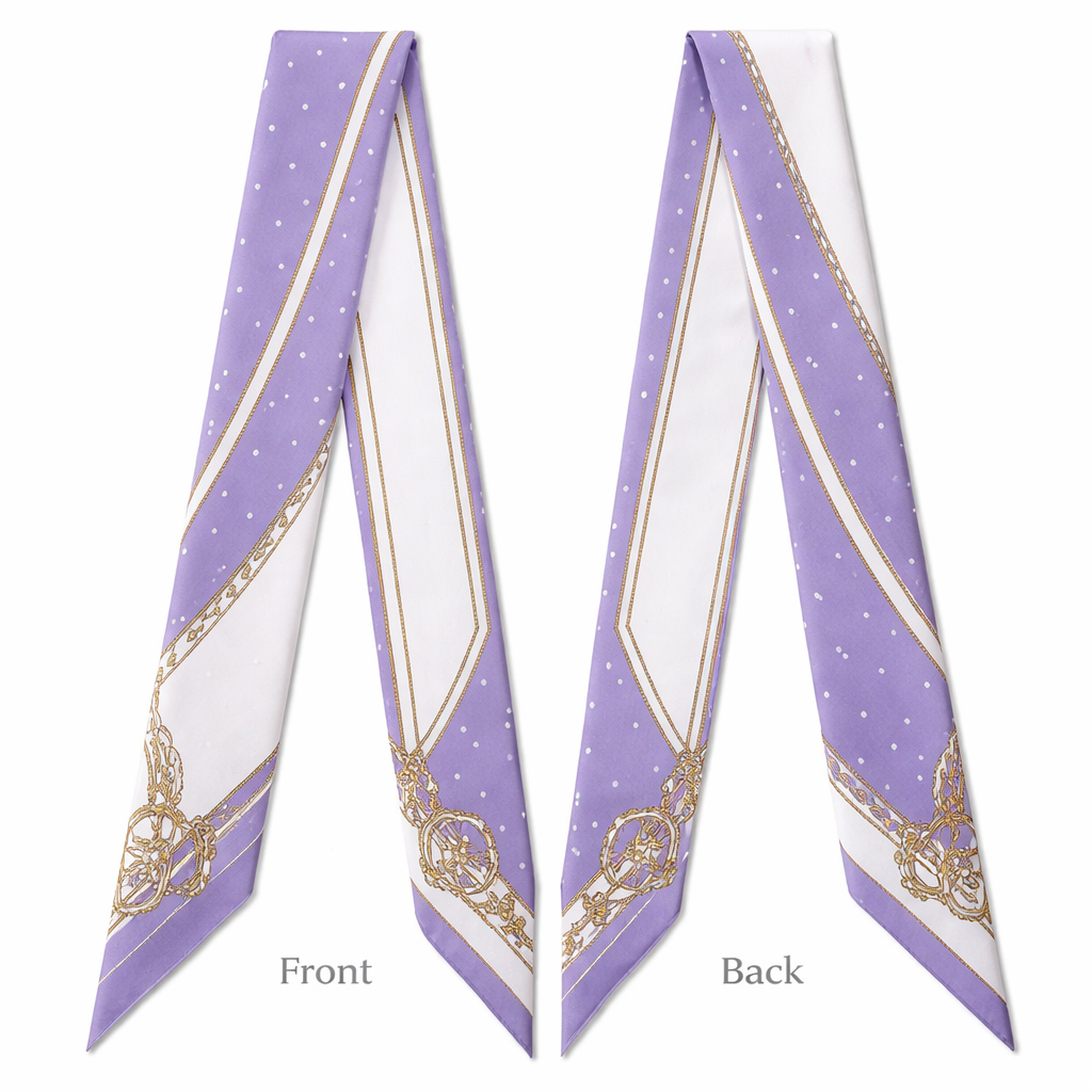Design a silk twilly scarf that is 5x86cm. It needs to be tailored and simple with the colors purple and white, classic style, show front and back