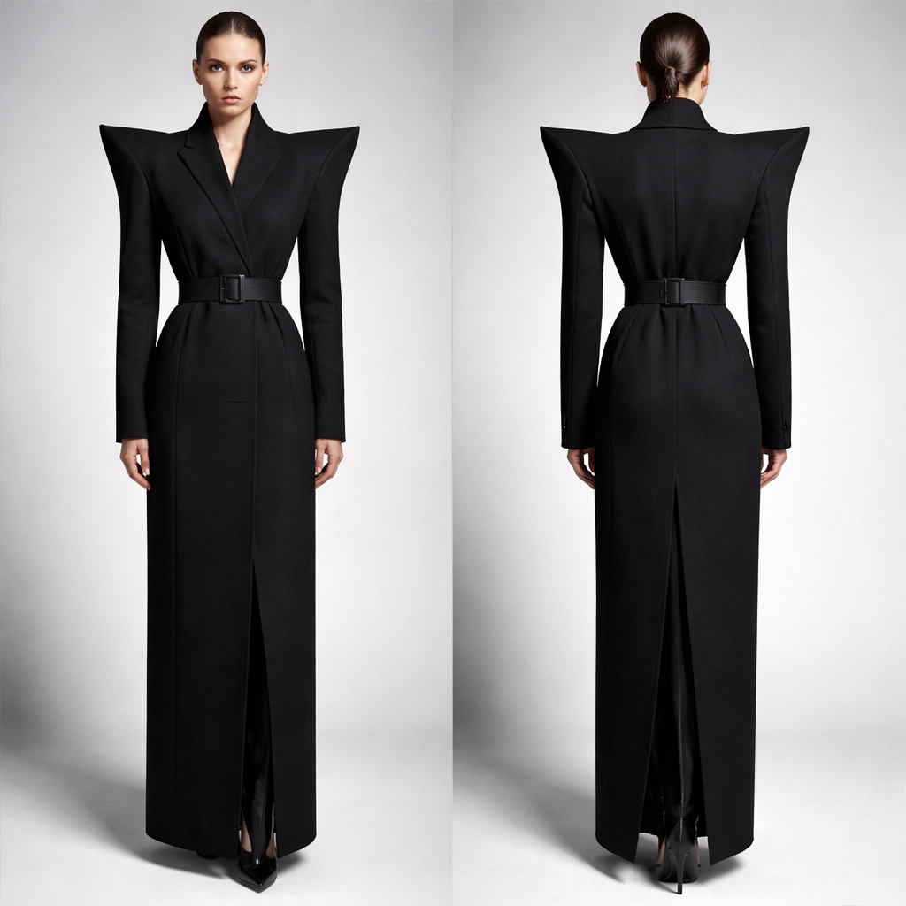 COMMAND COAT Long vertical authority coat with exaggerated shoulders and narrow column base. Key features Extended shoulder line (almost horizontal) Severe vertical length Hidden closure Belt emerging from seams Military / authority energy Fabric: Gabardine / Twill