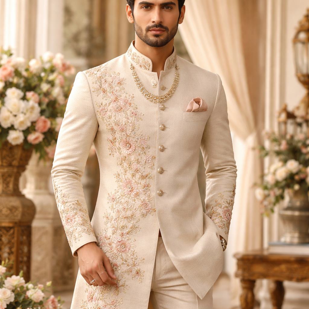 A Male Coat design, suitable for Spring, in Elegant style. India fashion aesthetics.