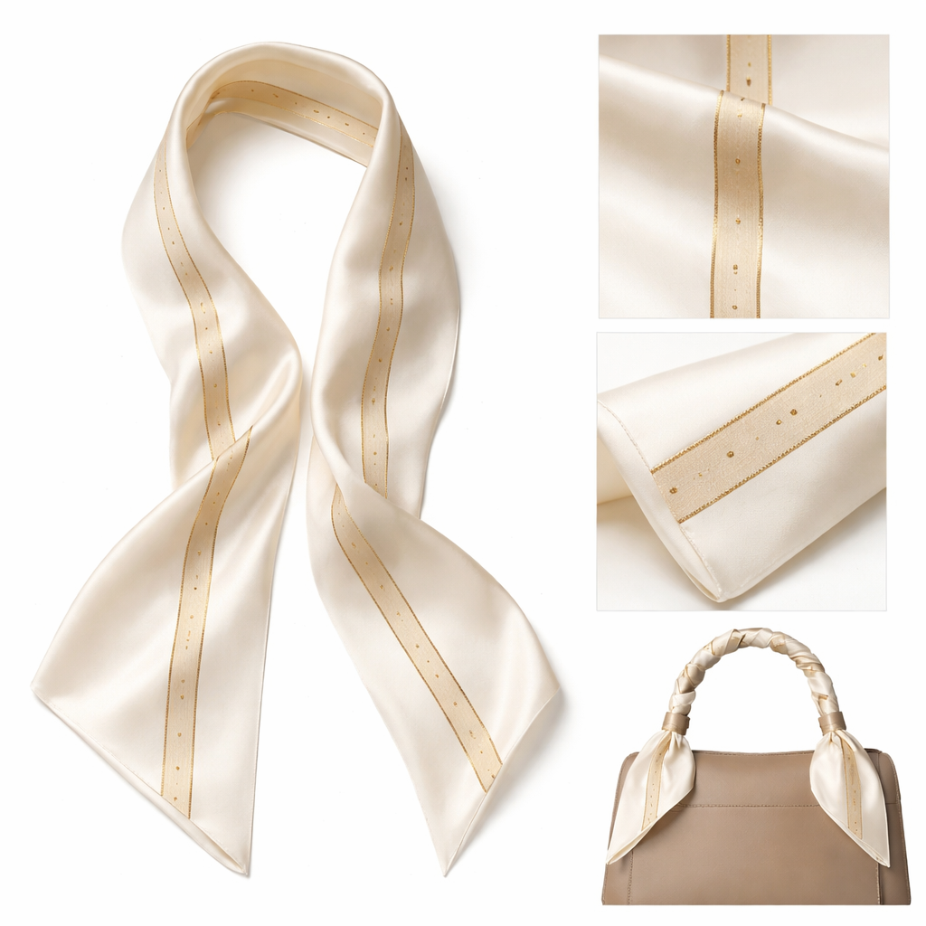Design a silk scarf thanks 5x 86cm to be wrapped on the handle of a purse. • Silk base: Ivory • Pattern: Single thin champagne-gold stripe running lengthwise down the center • Accent: Tiny evenly spaced geometric dots along the stripe • Style notes: Clean, modern, understated; lengthwise pattern ensures visual continuity when wrapped around a purse handle • Finish: Rolled hem in matching ivory thread, classic style, show front and back
