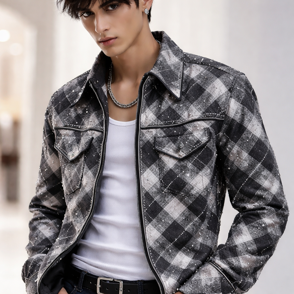 a checkered shirt with small pearls and diamonds, a nice cut, not baggy, more Y2K style, so it has a lot of swag, grey, white, and black for men