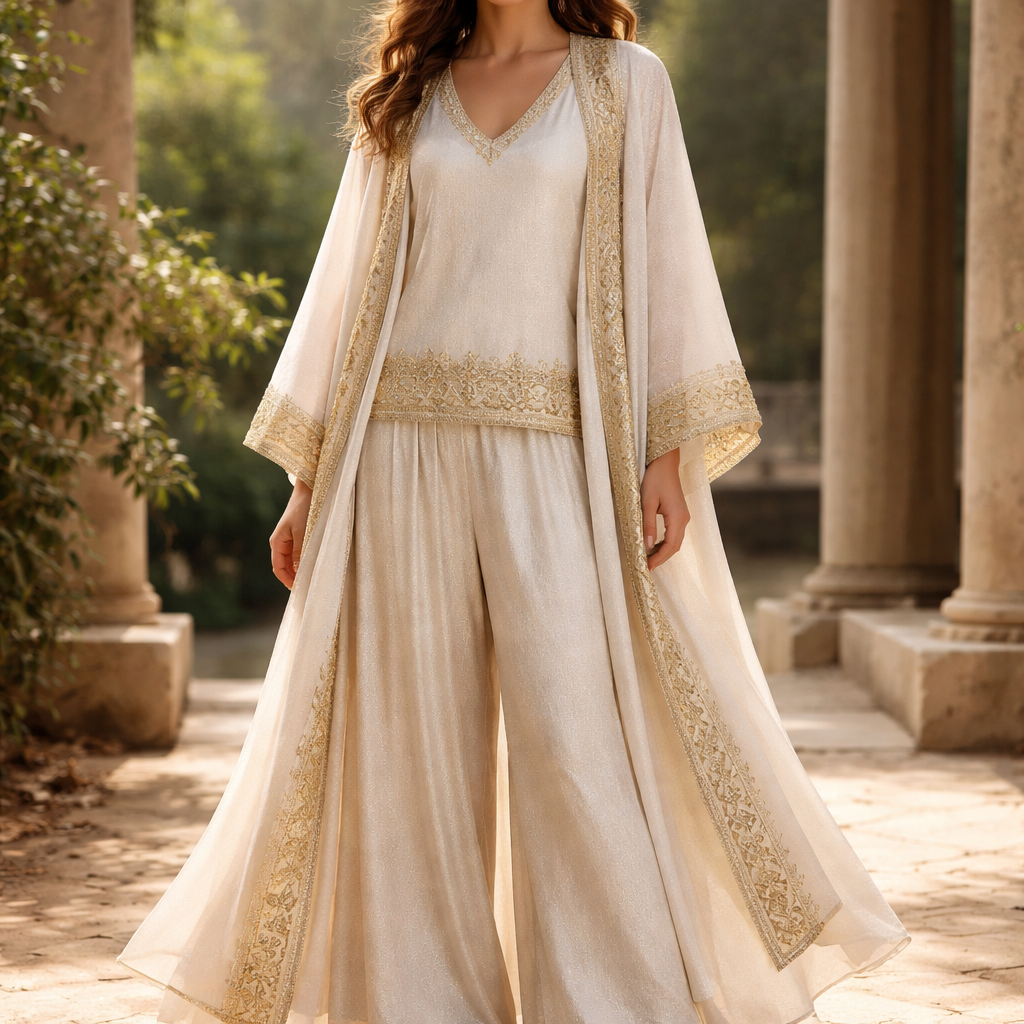 Israelite, a bit modernized, make an outfit having four pieces, flowy pants like skirt, shirt has a v-neck with (thin) gold threaded embroidery around the neckline and at the bottom of shirt, a wider evident embroidery, robe is not singed but flowy, over the robe is a vest that lays light and also flowy the edge is knee length, the look, a bit humble, comfortable, yet Atelier conservative and unique in its design, eco-friendly, sustainable (BAMBOO) round neck line, fabric-in white glistening hemp, the look: a mixture of earthy tones- the fabric looks light and flowy, shimmery gold when the sun hits it, authentic Hebrew embroidery is shimmery rich gold around the outer edges. Robe like “Jesus” the length is to the floor, looks classy and of very high end quality,