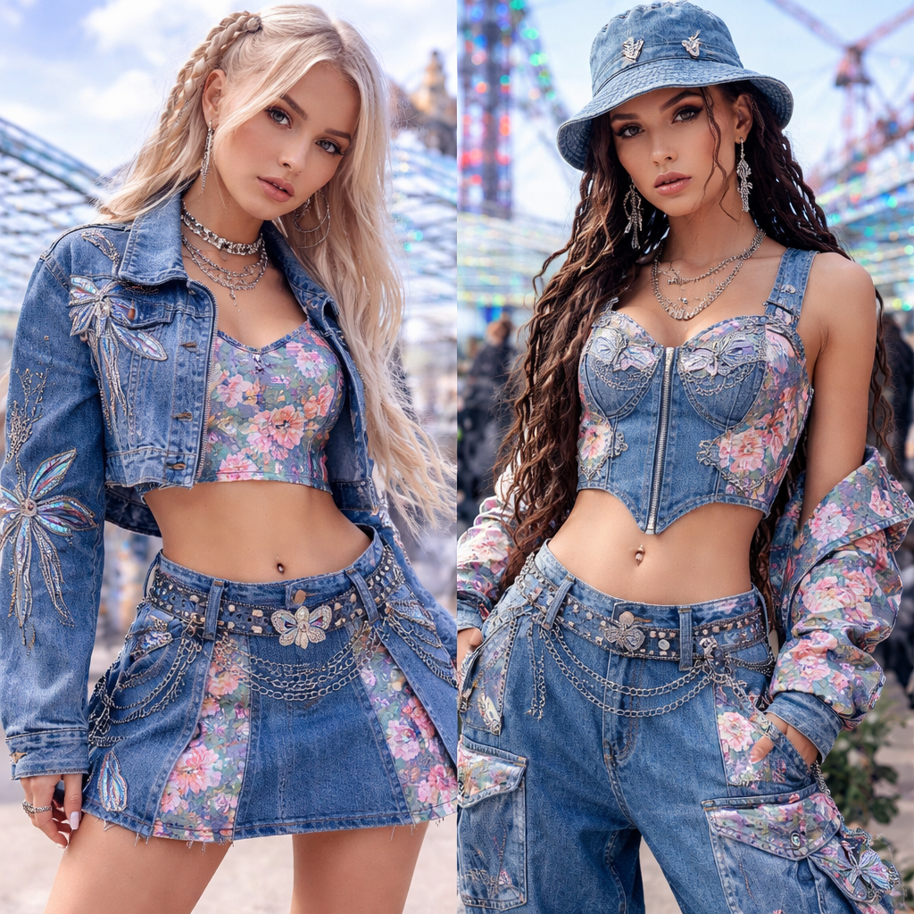 Create a damselfly for streetwear under the techno culture fusion using demin and floral fabrics for two