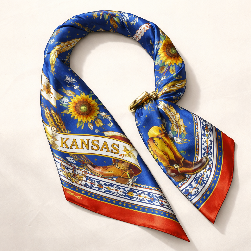 Create a silk scarf that fits the dimensions to wrap around the handle of a small Kelly bag in Kansas state colors. Keep it classic with a little western