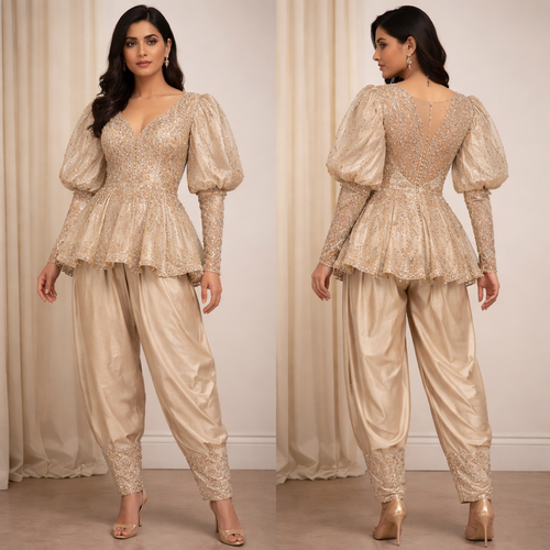I want a blouse in muted yellow colour with slitted puff with button sleeve, net an stone work on the front blouse area,...