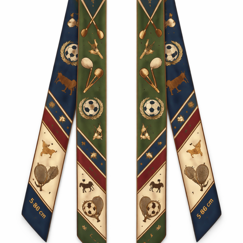 Design a silk scarf that is 5 x 86cm that wraps around a handle of a handbag American Sporting Heritage Classic American preppy silk twilly inspired by traditional sporting scarves, collegiate elegance, and timeless country-club style—refined, understated, and archival Incorporate this style specifically for Kansas City, MO hosting the world cup 2026. More simple with no words or logos, classic style, show front and back