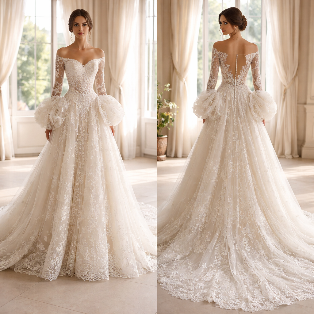 I want a lace wedding dress with long sleeves and puffs on the waist, show front and back