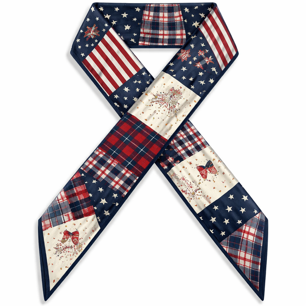 Design a silk twilly scarf that is 5x 86cm that is for the United States of America’s 250th birthday. No words or logos. Ralph Lauren vibe. Way simpler. Even more simple. Add a subtle element of celebration. Make it preppy. Add feminine touch no bows. Add patchwork like from quilts less sweet too much like a picnic table, classic style, show front and back