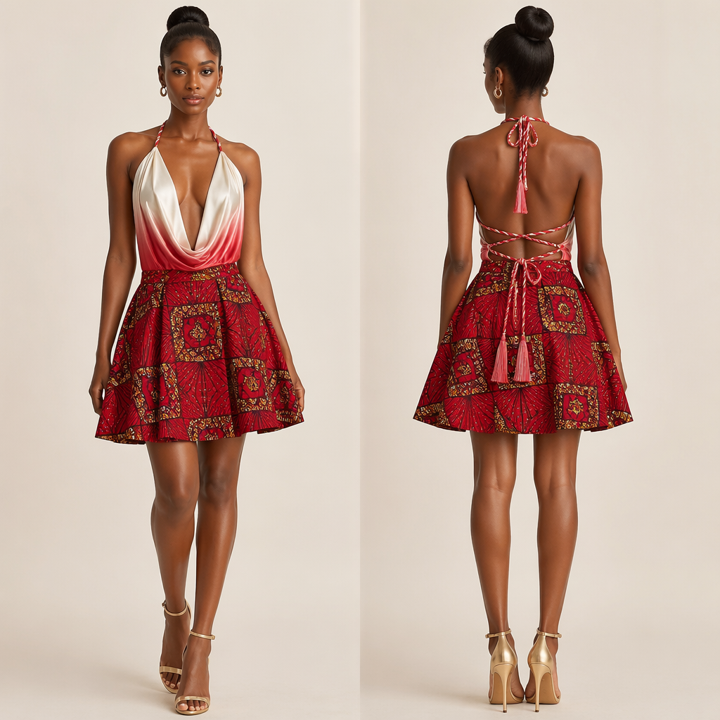 Je voudrais créer une robe qui mélange le moderne et le traditionnel. Le haut de la robe doit avoir un col qui baille effet drapé et la matière est en soit ombré avec 2 thon. Du blanc et du rouge. Le bas est un tissu africain en pagne rouge à une forme évasé . Je voudrais que le décolleté soit plongeant sans être vulgaire et les manches soir en forme de corde que l’on attache autour du cou et qu’il ya également des corde à l’arrière du dos pour cintré la taille. La robe doit être juste au dessus des genoux . La robe doit être porté par un mannequin de taille standard oú l’on voit la face et le dos.