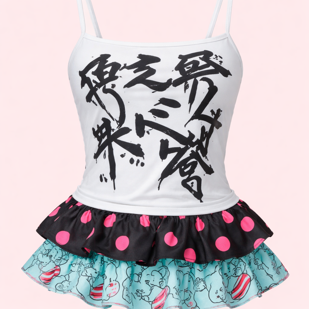 Korean Fashion fashion design: A white cotton tank top, fitted and feminine, with random black Asian graffiti. Features two tiered ruffles: a black layer with large hot pink polka dots, and a final layer with aqua cat line drawings accented by red stripes.
