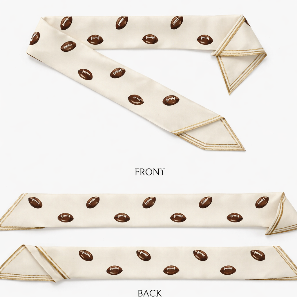 Design a silk scarf thanks 5x 86cm to be wrapped on the handle of a purse. This is for a collegiate graduation ceremony. No logos or any school relation. Make it vintage football . Way more simple and tailored just footballs Ivory and neural, classic style, show front and back