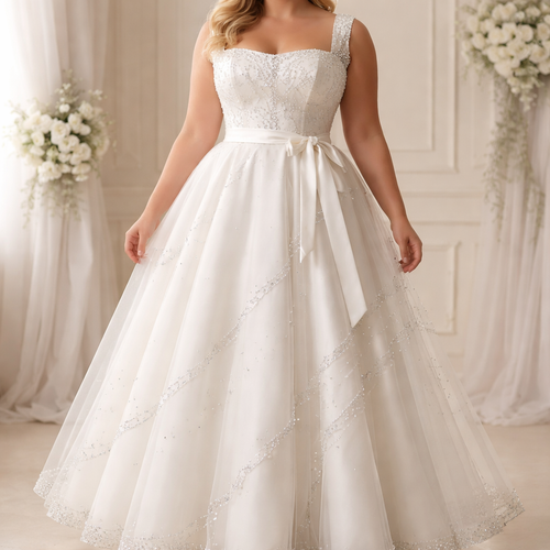 Wedding style dress. White. Size 14 UK. Corset bodice, silk. Thick wide, folded sleeveless straps. Box shaped neck line....