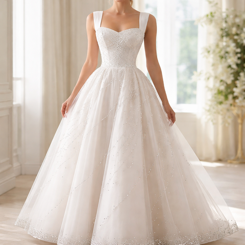 Wedding style dress. White. Size 14 UK. Corset bodice, silk with gauze overlay, studded with clusters of diamonds. Thick...
