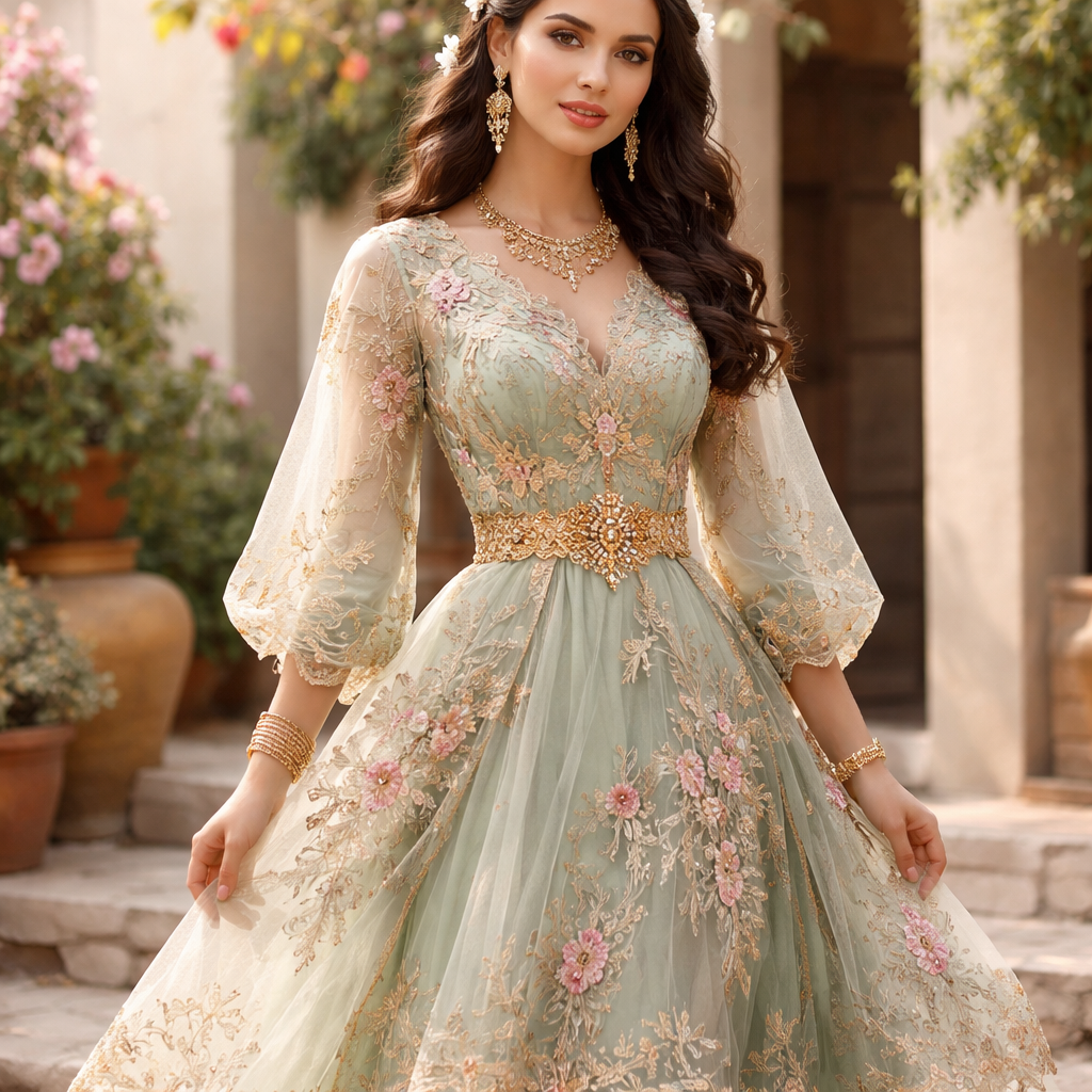 A Female Dress design, suitable for Spring. Algeria fashion aesthetics. Current season is Spring in Algeria.