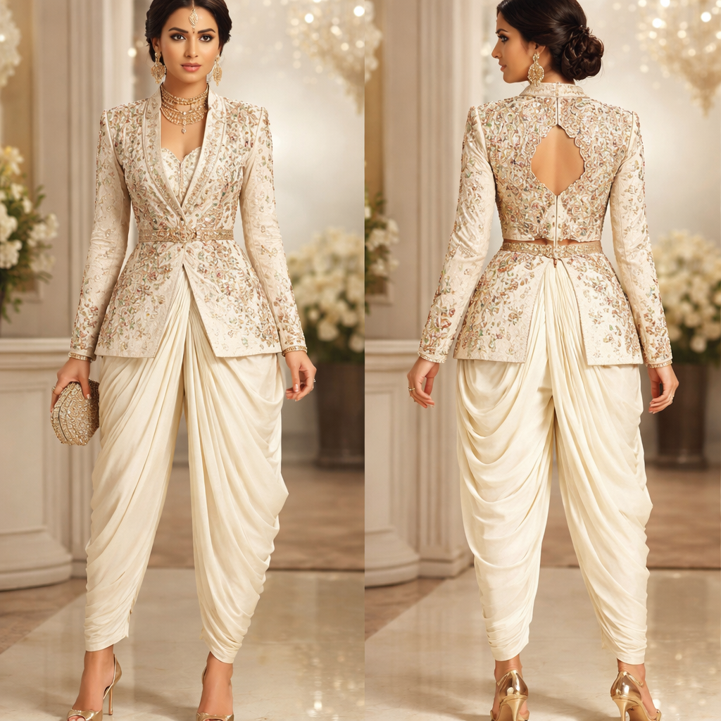 Stitched Dhoti and jacket top for women - add traditional flair , business style, show front and back