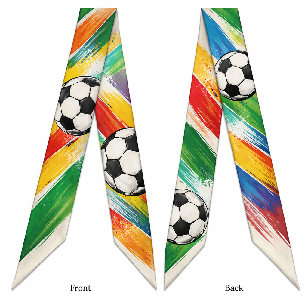 Design a silk scarf that is 5x 86cm with oblique edges. Make it an abstract soccer theme. Super simple . Make the soccer balls abstract