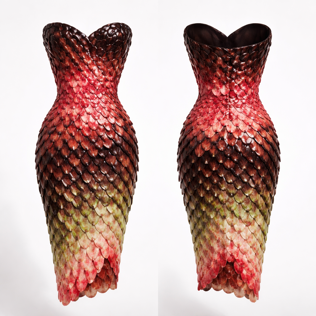 Dress, flowy, no straps, midi, form fitting, made of layered watermelon seeds , show front and back