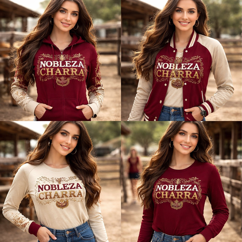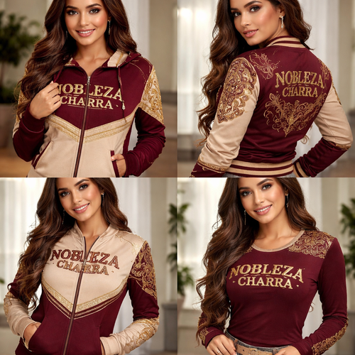 Hazme una sudadera de cierre, chamarra y playera de manda larga, de los colores vino, dorado y beige, dame diferentes op...