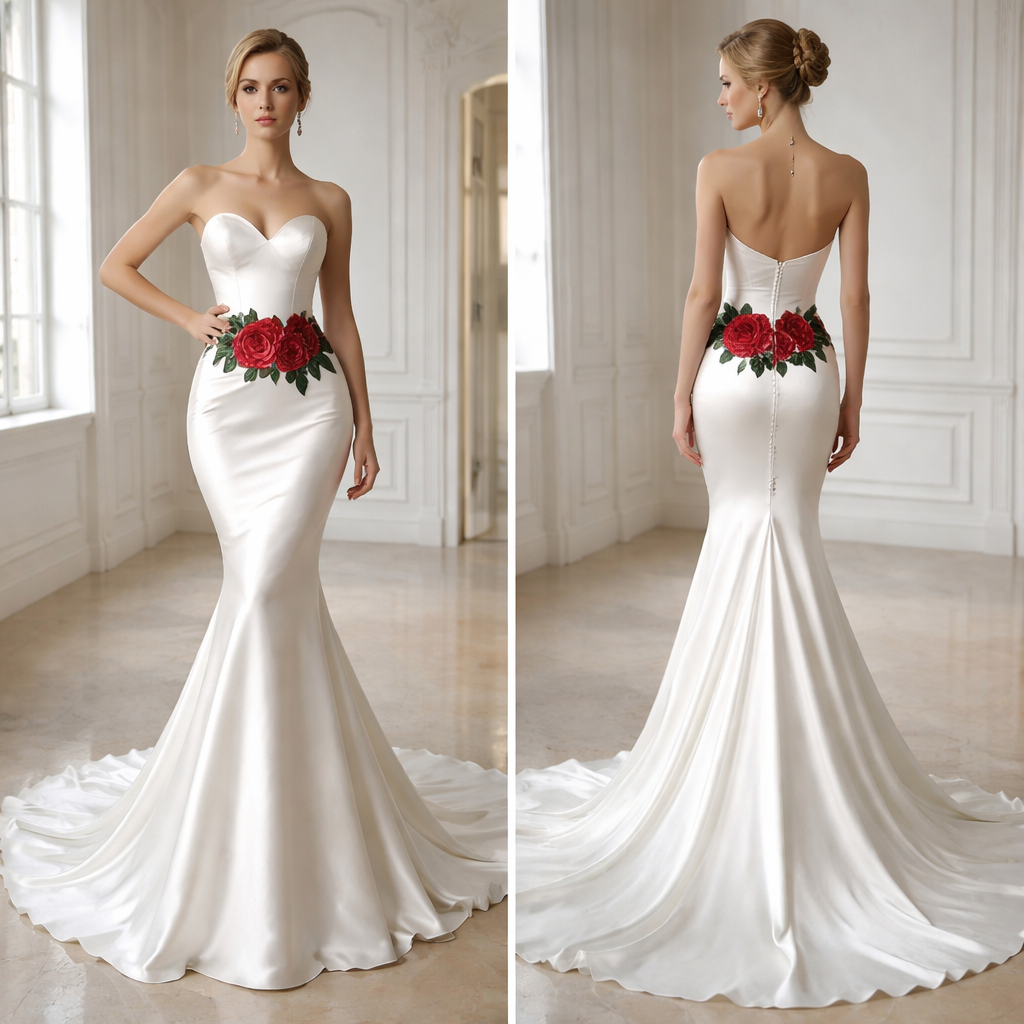 Silk white fabric, red rose with leaves around waist, mermaid shape, long dress, classic style, show front and back