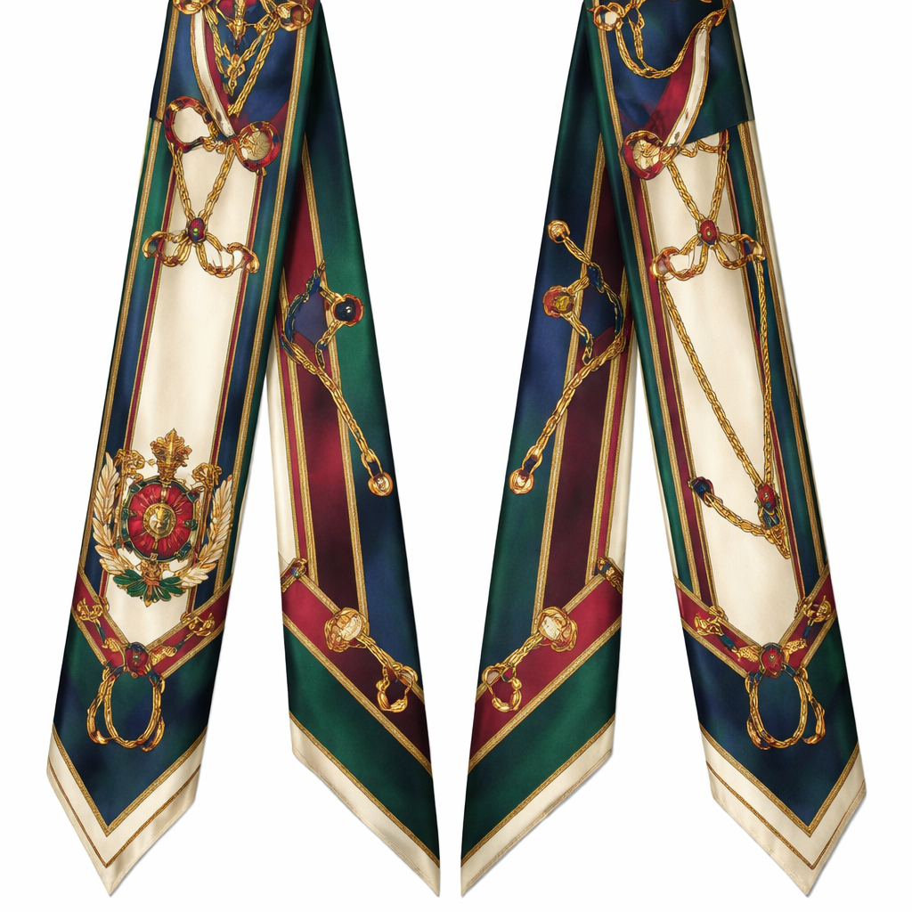 Design a silk scarf 5x86cm that has a feminine equestrian old money heritage feel with gem tones , classic style, show front and back