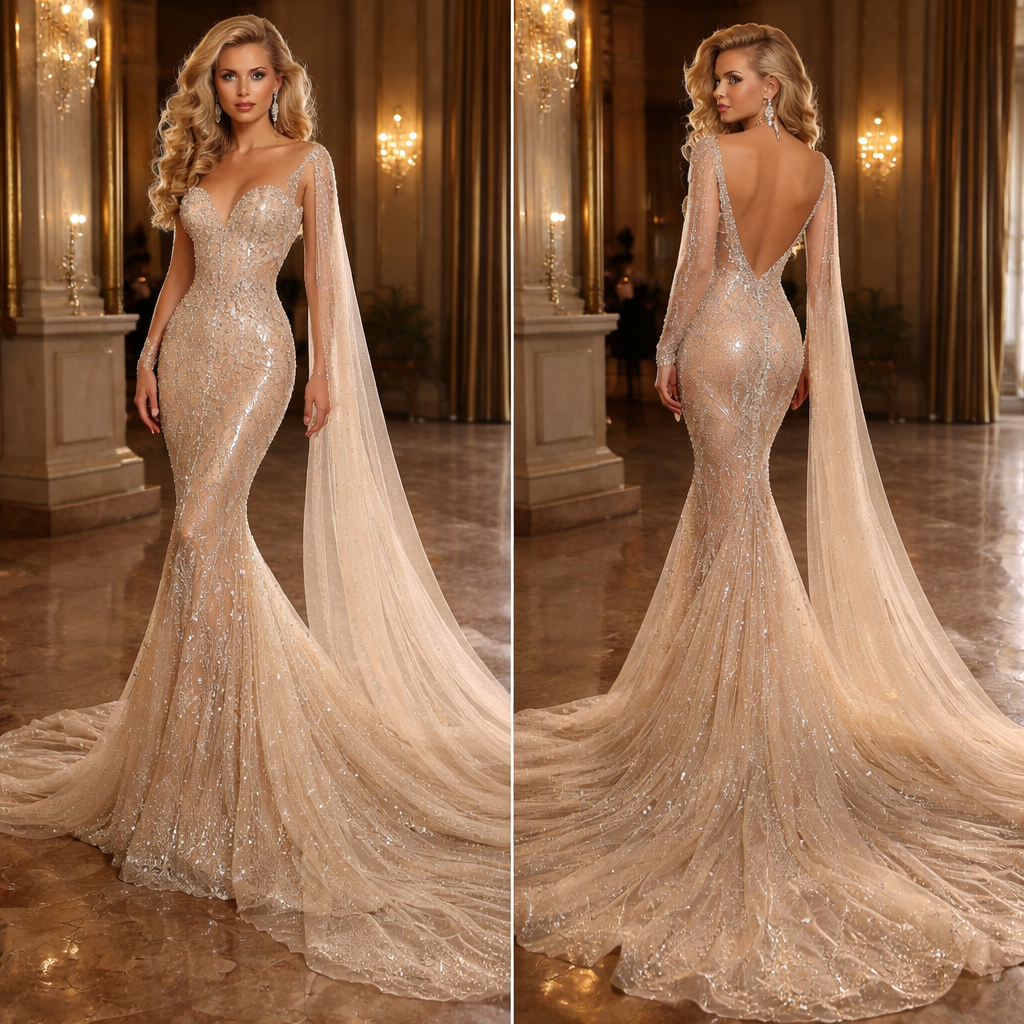 Create a glamorous couture dress with long flowing train with a tight sillouete, glamorous style, show front and back
