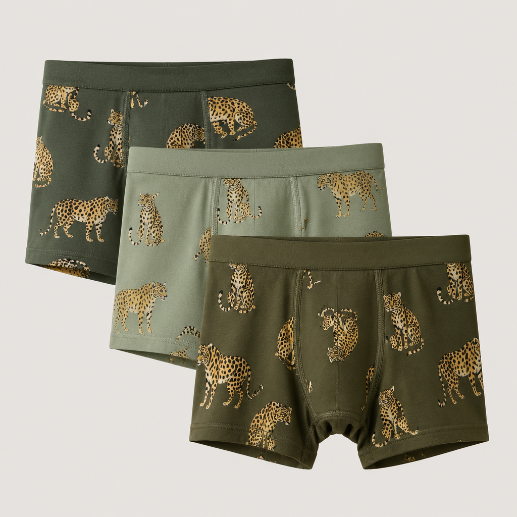 A Male Accessories design, in Animal Print style. Boxers kids, seamless, 3 pack. Green, ultra soft, with leopards on them.. Sweden fashion aesthetics.