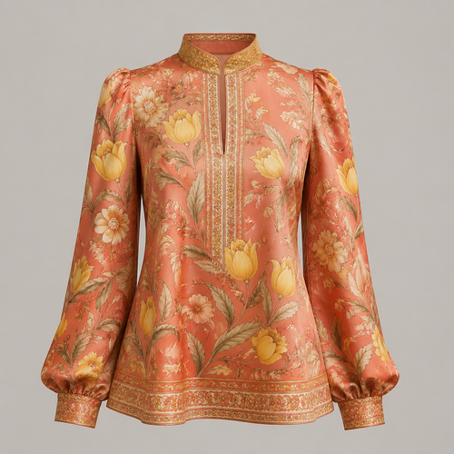 A Female Top design, made of Silk, for Festival, suitable for Spring, in Elegant + Middle Eastern + Floral style. yellow...