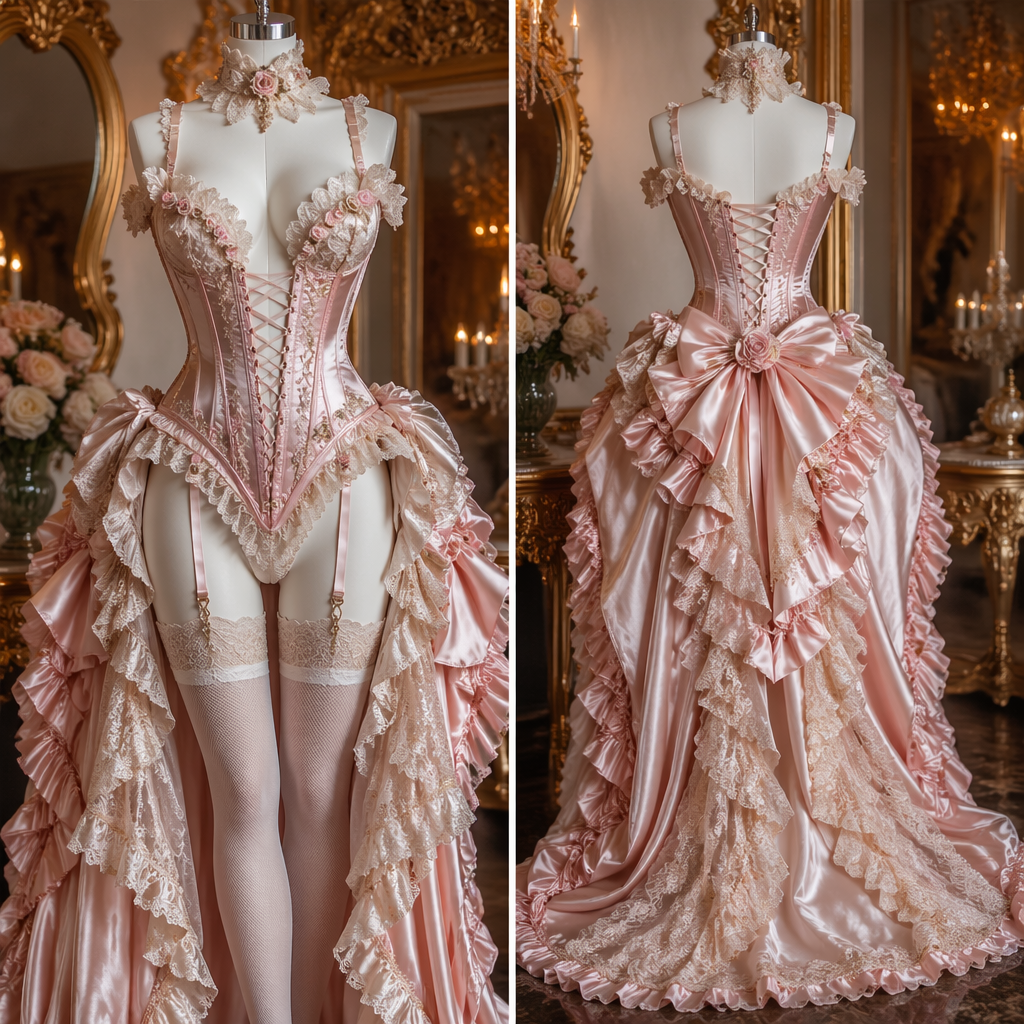 photorealistic fashion design, Marie Antoinette inspired corset lingerie, luxurious satins, lace, deep plunging neck, maximalist boudoir, petticoat train in back, glamorous style, just the design no text, show front and back