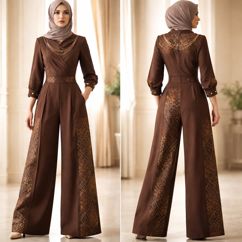 Crée un pantalon ample féminin avec un haut pour le travail, élégante et rare, style ample . Je veux une coupe parfaitement structurée avec pantalon ample gros bas, taille marquée , ou manches 3/4, et un col asymétrique chic. Le tissu doit être premium, sobre et luxueux, dans des tons africain bogolan . Ajoute des détails couture subtils : boutons dorés, plis élégants, poches discrètes et finitions impeccables. Le rendu doit être sophistiqué, professionnel et digne d’une directrice générale. Fais le model avec des tissus de couleurs pour la bas de la combinaison et un autre design pour le haut . Fais la combinaison moins plaqué fais la combo saison sans ceinture stp change le haut stp il est trop sexy fais moi un truc qu’une voilée peut porter pas trop de fantaisie encore un autre model avec chaîne devant sur le haut Faites un autre model encore , show front and back