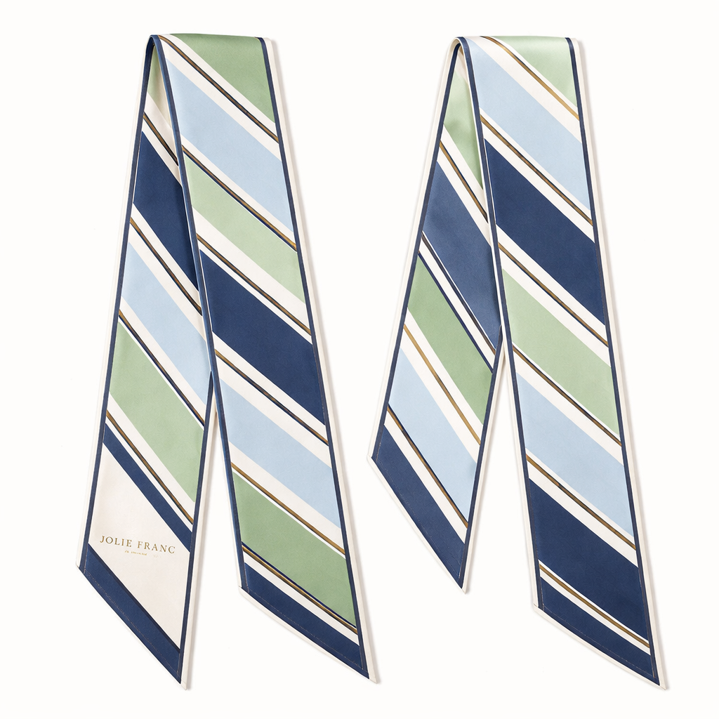 Design a 5cm x 86cm silk twill scarf for a luxury brand called Jolie Franc with an American preppy style and subtle British tailoring. Feature crisp regimental stripes inspired by Ivy League ribbons. Use a fresh spring and summer color palette of soft ivory, navy, sage green, and pale sky blue, with a discreet antique gold hairline accent. Include a thin framed border and hand-rolled edges. The design should feel clean, tailored, and timeless, instantly recognizable when wrapped around a Kelly-style bag handle or worn for refined warm-weather outings., classic style, show front and back