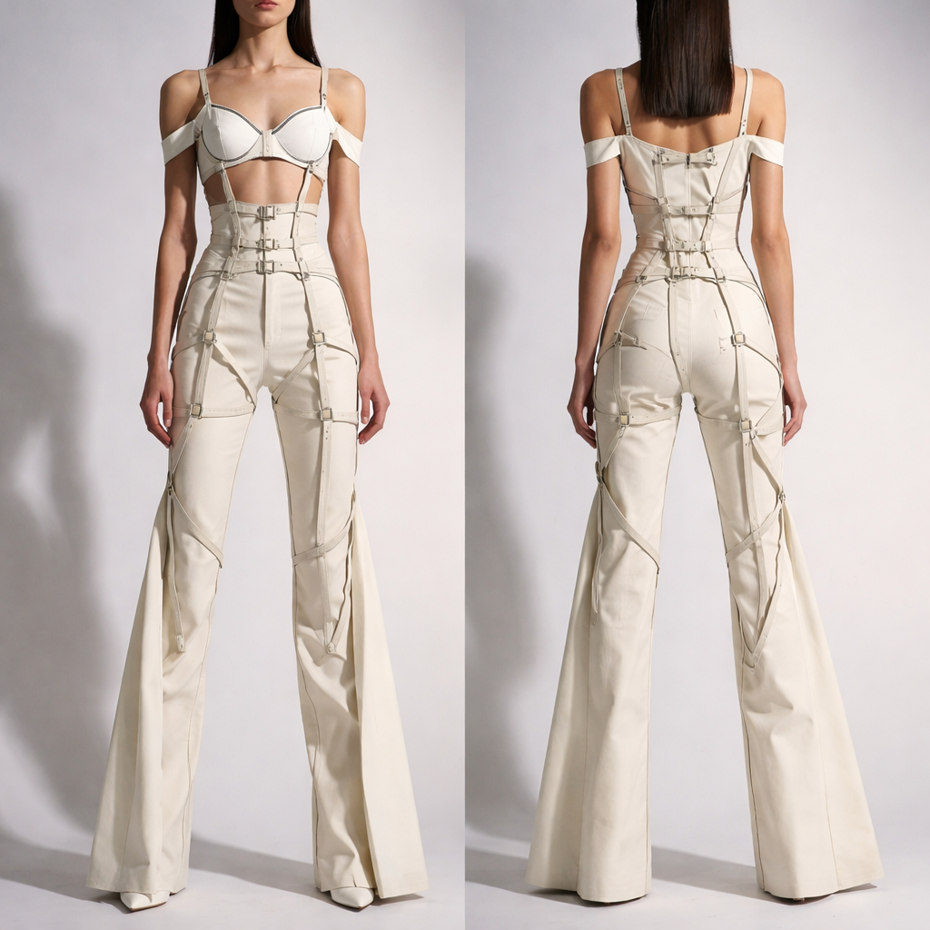 POWER TROUSER SYSTEM High waist elongated trousers with harness layering. Key features Extremely high waist Long leg proportion Strap / harness overlay Cropped structured top Fabric: Canvas / Denim Cone at the knee, haute_couture style, show front and back