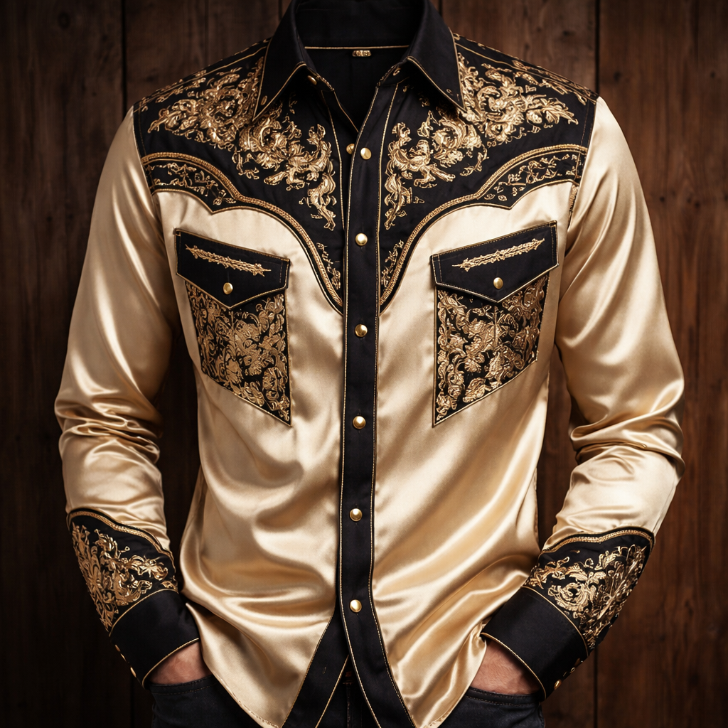 Casual shirt of gold, black and champagne colours, neo_western style