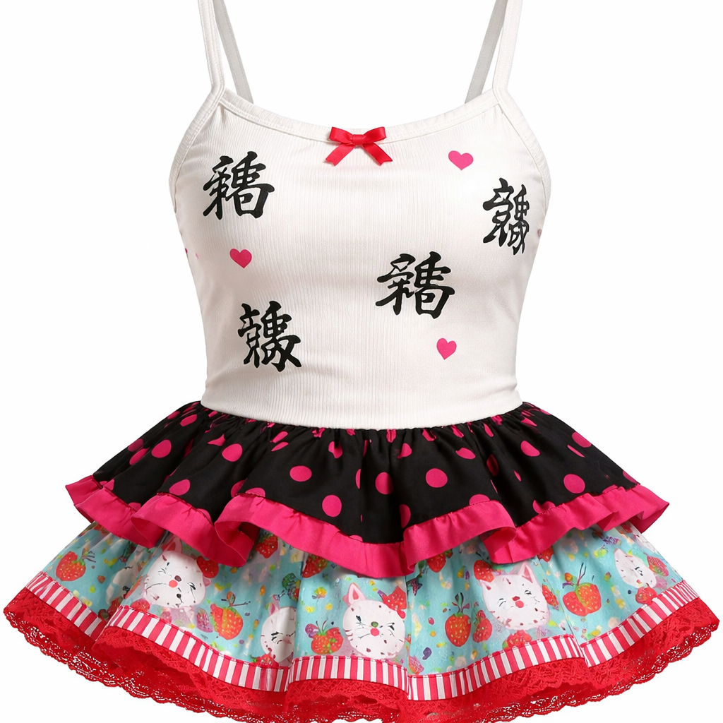 Romantic fashion design: White cotton tank top, fitted bodice, two ruffled layers at hem; one black with hot pink polka dots, one aqua cat print with red stripes. Black Asian lettering randomly placed.