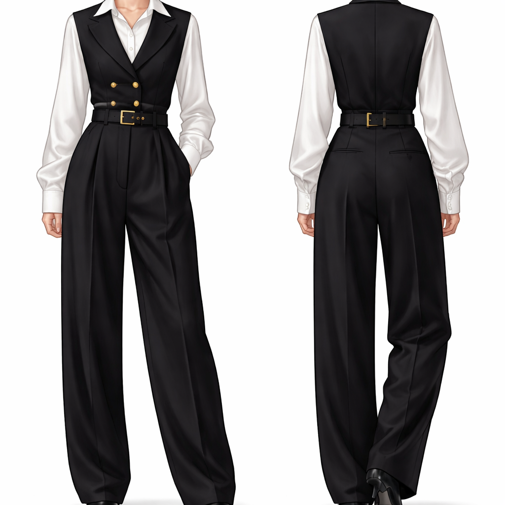 don’t draw the face but the fabric should be of that of a suit a baggy black trouser , paired with a white shirt long sleeve and a half vest blazer with golden buttons on top the blazer is also black add a belt too , show front and back