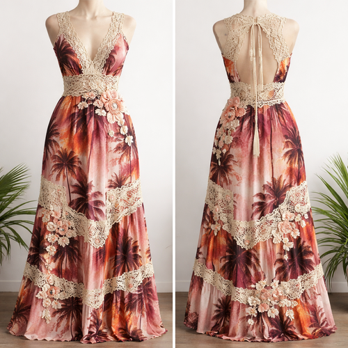 Plain cut boring long dress turned into a chique long dress by adding crochet and crochet applique elements. The fabric ...