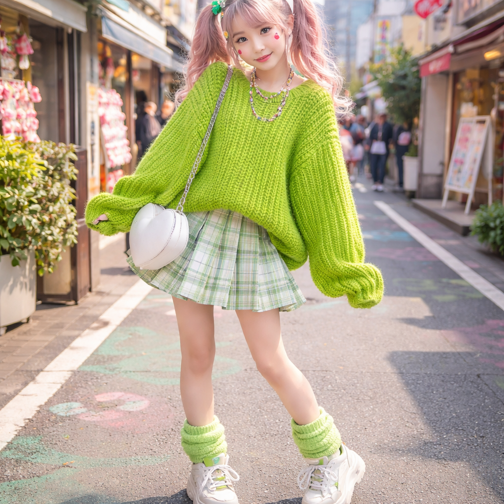 Japanese Street fashion design: Cute, oversized, bright green knit sweater. Paired with a playful pleated skirt and platform sneakers, embracing a relaxed yet bold Harajuku vibe.