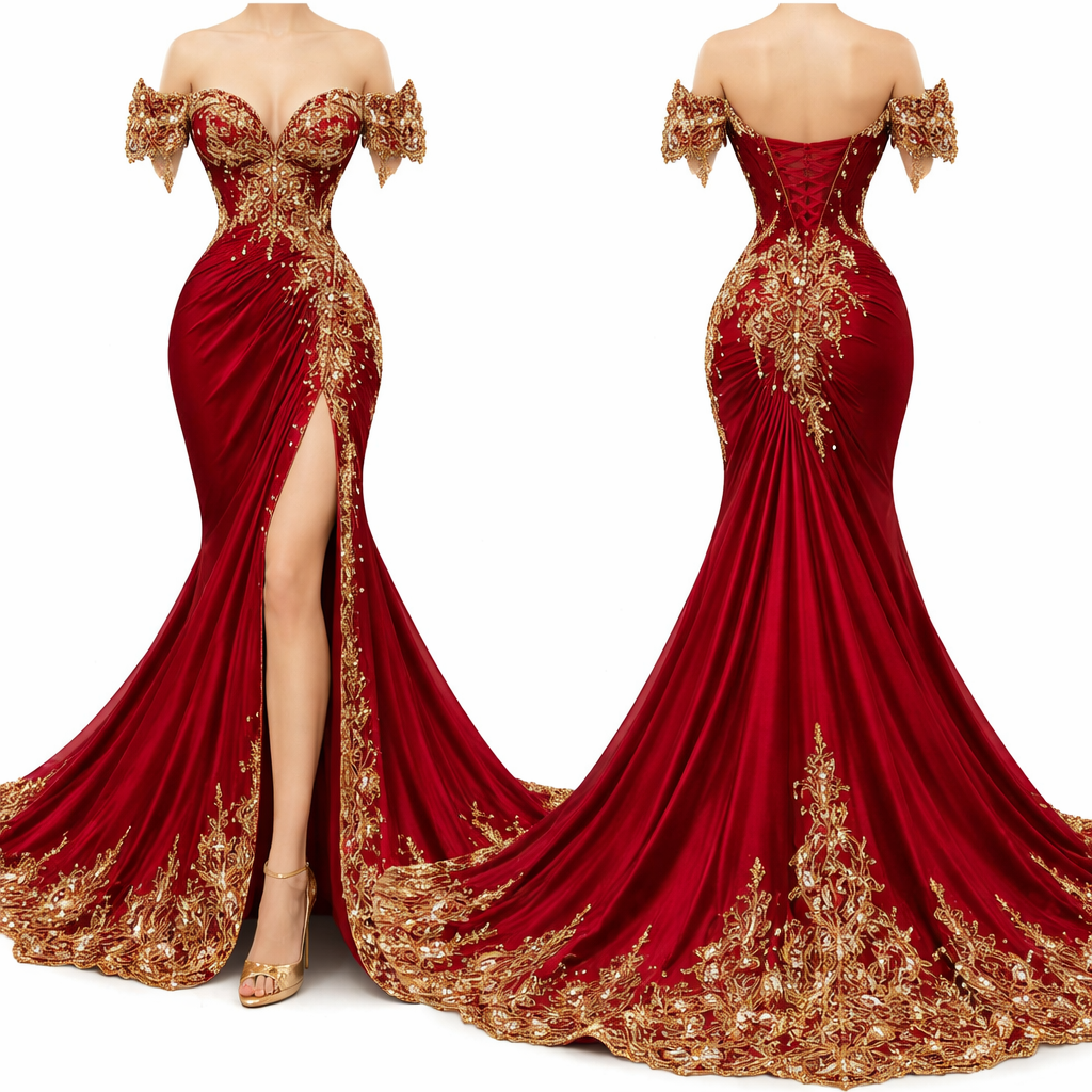 Red sequin body on dress with feather at bottom. Ankle length. Fitted at the legs down too.