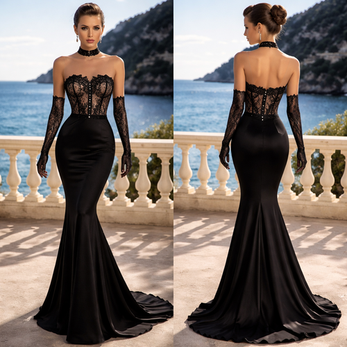 Luxury Italian designer evening dress. Black satin corset midi dress with a structured sweetheart neckline and thin straps. The bodice features transparent black lace that extends from under the bust to the waist, creating a sensual corset effect. The lace has intricate floral embroidery and slightly rises above the neckline for a signature detail. The waist is extremely sculpted with vertical corset seams. The skirt is sleek satin, body-hugging, midi length. Elegant, sophisticated, sensual. Inspired by Italian luxury fashion houses. High-end couture aesthetic, editorial fashion photograp, lace style