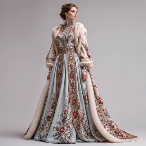 A Female Dress design, suitable for Spring. Consider Russian fashion — fur and layering traditions, bold patterns, mix o...