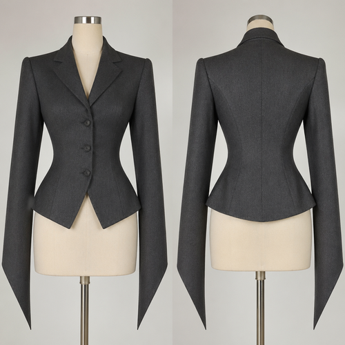 A Female Jacket design, in Korean Fashion style. quiero una chaqueta plateada blanca y negra muy agresiva y elegante que...