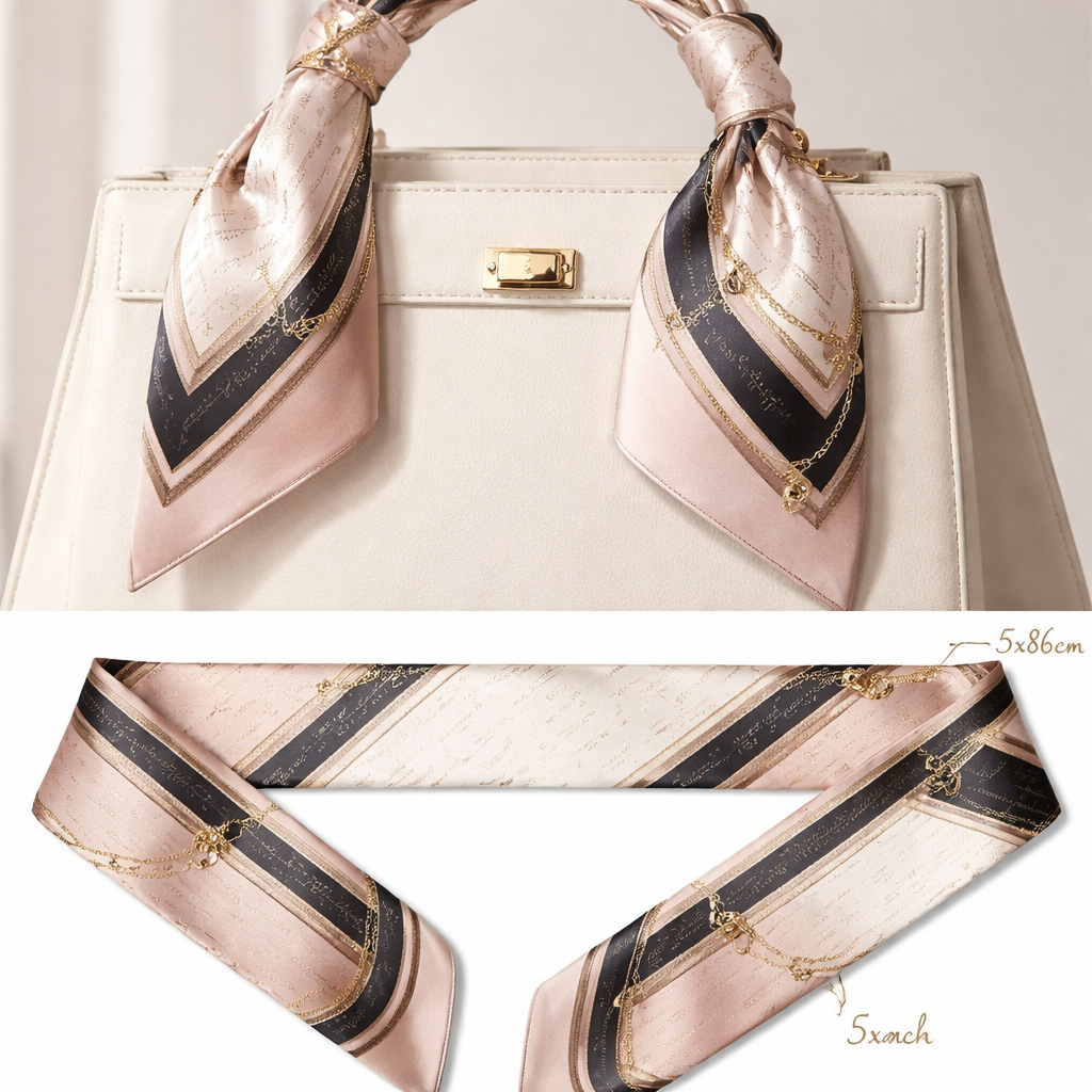 Design a silk scarf thanks 5x 86cm to be wrapped on the handle of a purse. Jolie Franc” repeated subtly Execution • Hand-drawn serif or script typography • Micro-text patterns alternating with solid silk, classic style, show front and back