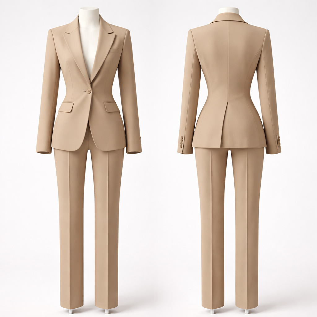 Create me an outfit with 63% polyester, 34% rayon, and spandex 3% 260 gsm. Suit 2 piece, show front and back