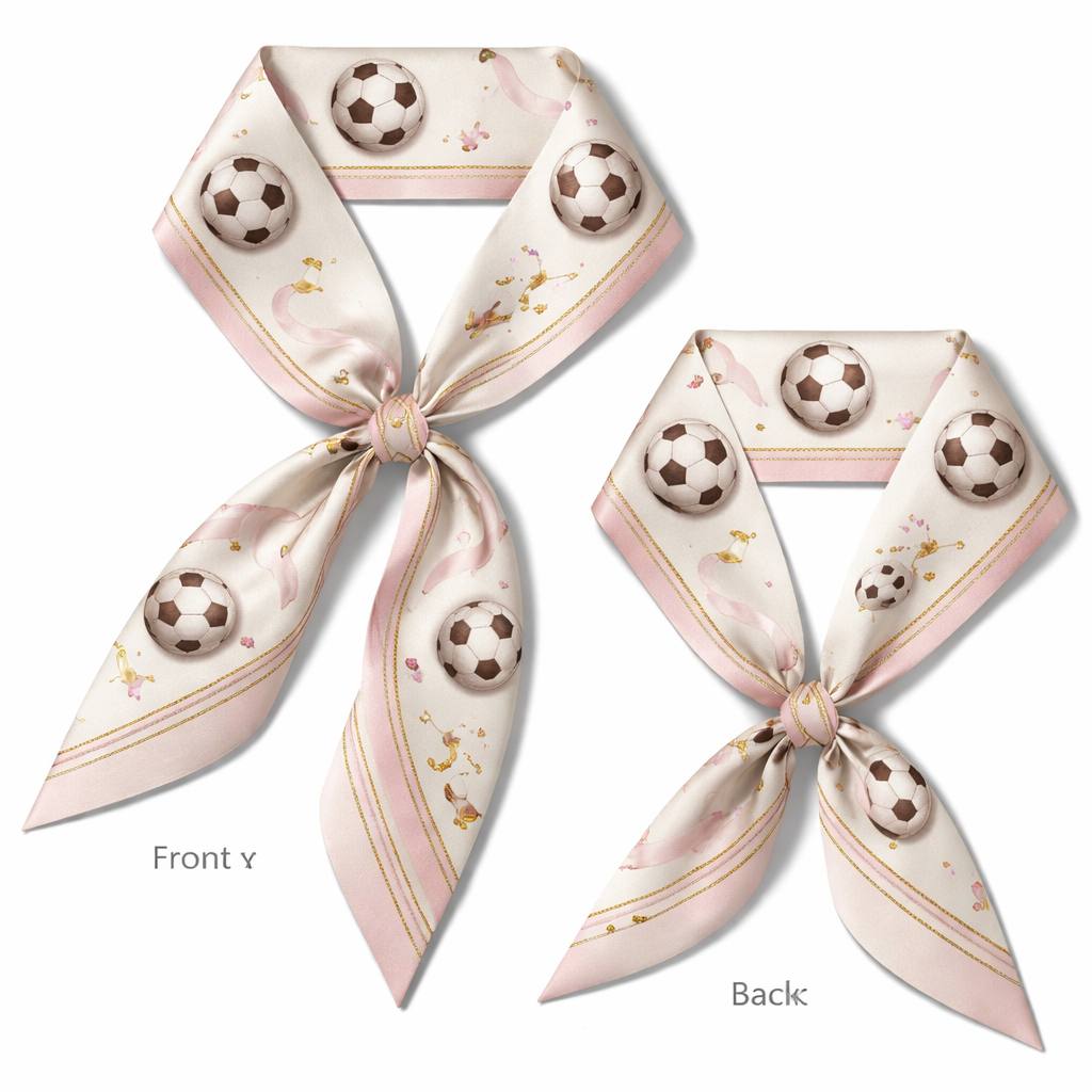 Design a silk scarf thanks 5x 86cm to be wrapped on the handle of a purse. No logos or any school relation. Make it footballs . Way more simple and tailored just football Ivory with feminine sporty touch, classic style, show front and back