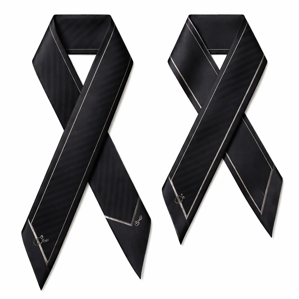 Create a 5cm x 86cm narrow silk twill scarf in a luxurious minimalist style. Base color: deep black with subtle tonal pinstripes in graphite grey and metallic silver highlights. Hand-rolled edges. Designed to wrap around a Kelly bag handle or wear as a sleek neck ribbon for upscale events and theater evenings., classic style, show front and back