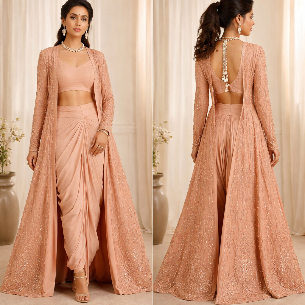 Dhoti: Warm dusty peach crepe Blouse: Same tone (add pearl tassel to the blouse) Jacket: 1 shade darker apricot (heavy Georgette fabric with lining and floor length jacket and with flares) Work: • Tone-on-tone thread embroidery • Vertical vine pattern • Minimal shimmer (no heavy zari)