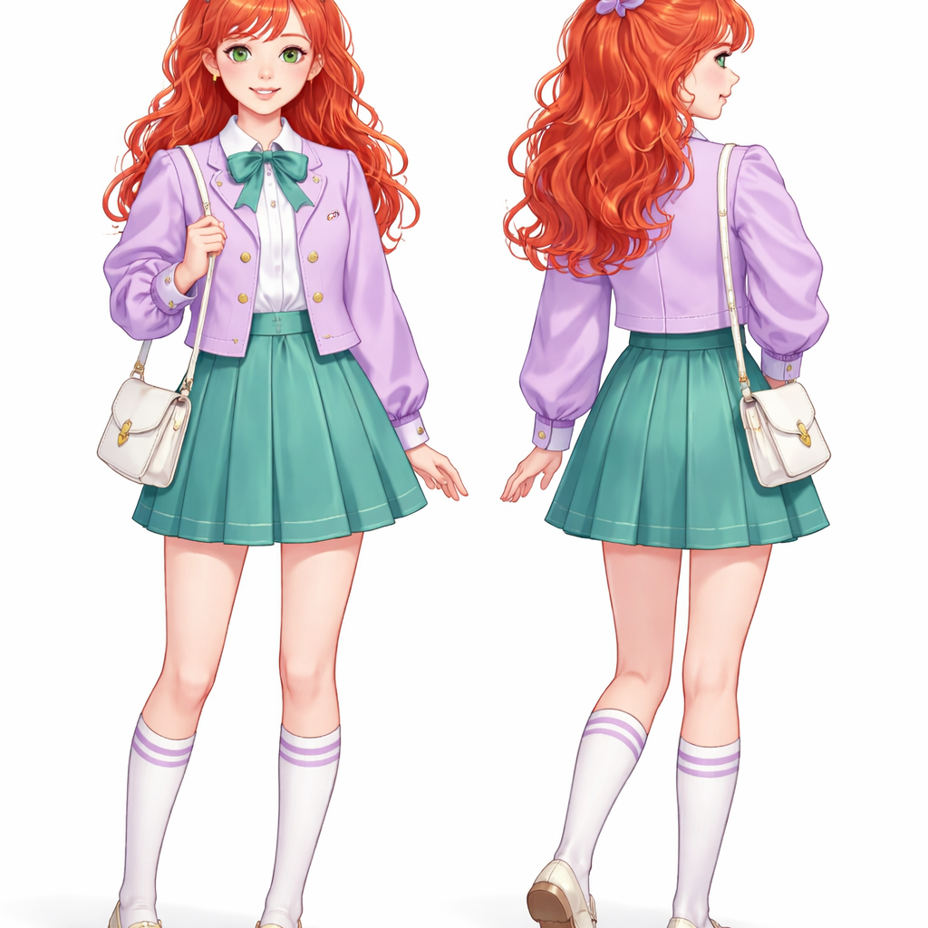 A teenage European girl with bold wavy red hair a lilac blazer with puff sleeves and a sea green skirt , school_uniform style, show front and back