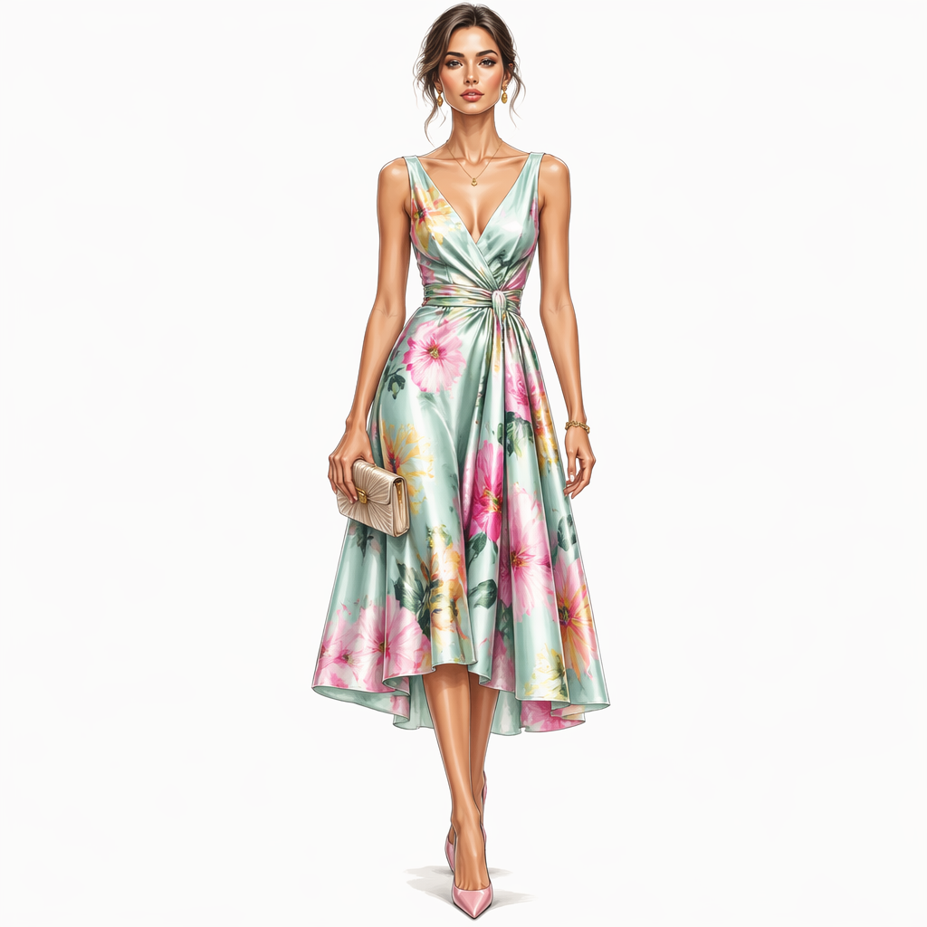 Vestido elegante de primavera corte midi, tela de seda floral , color pastel, incluye accesorios collar fino de oro, aretes a juego, pulsera delicada , cartera de mano tipo clutch y zapatos de tacón tiene que ser en boceto con cara , cabez , brazos , piernas , manos todo lo que lleva un boceto le falta accesorios collar aretes, y el color del traje que sea subidos de colores
