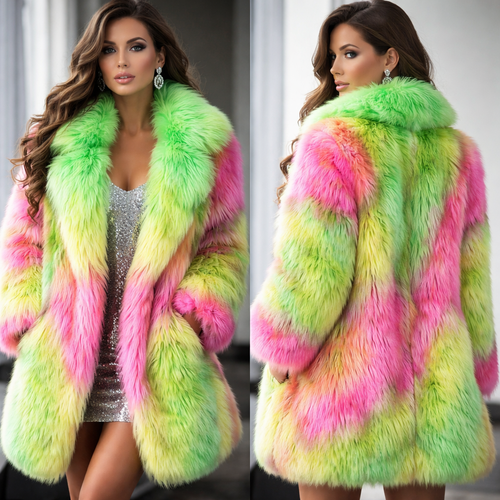 A stylish beautiful woman wearing a neon fur coat that fits her perfectly, focus on the texture of her coat, luxurious, ...