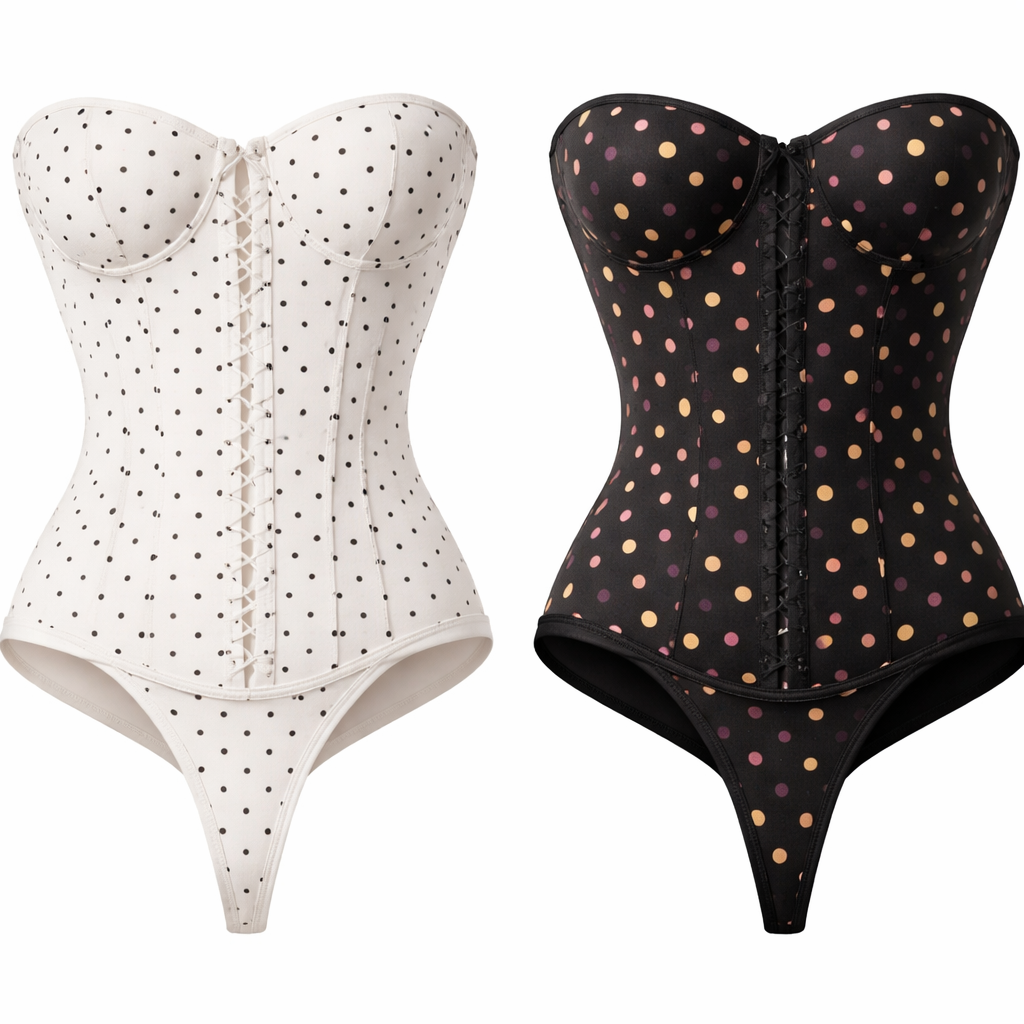 Shape wear no ai model all cotton seamless g string white and black pocker dots strapless corset no built in bra just corset in bodysuit pink and yellow pocker dots other way around black