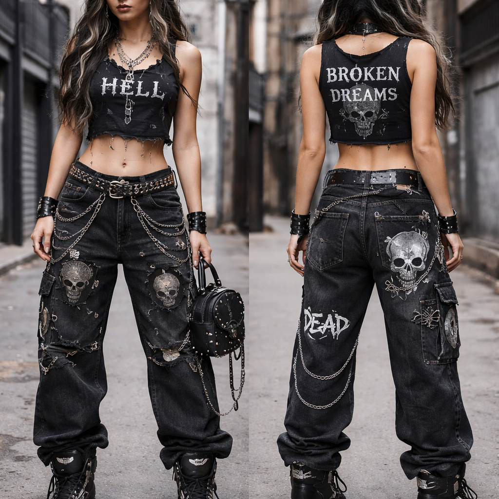 help me come up with conc emo grunge swag to help me style my giuseppe zanotti sneaker shoe..baggy jeans and some nice tops but customised black jeans and customised crop top or shirt, grunge style, show front and back